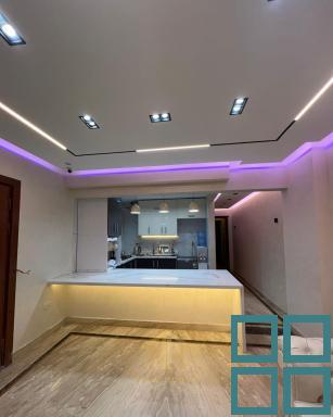 * The staircase landing ceiling is finished with a suspended gypsum board ceiling with three spotlights.