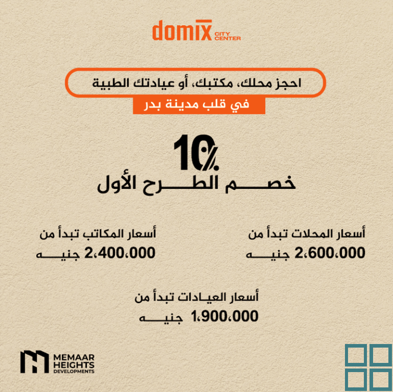 Near To:Directly on Field Marshal Ahmed Badawi Road (Central Services Area). It mediates all residential neighborhoods in Badr City. Next to the most important landmarks known in the city of Badr (the City Authority - the Russian University - the Central - the main branch of the National Bank)